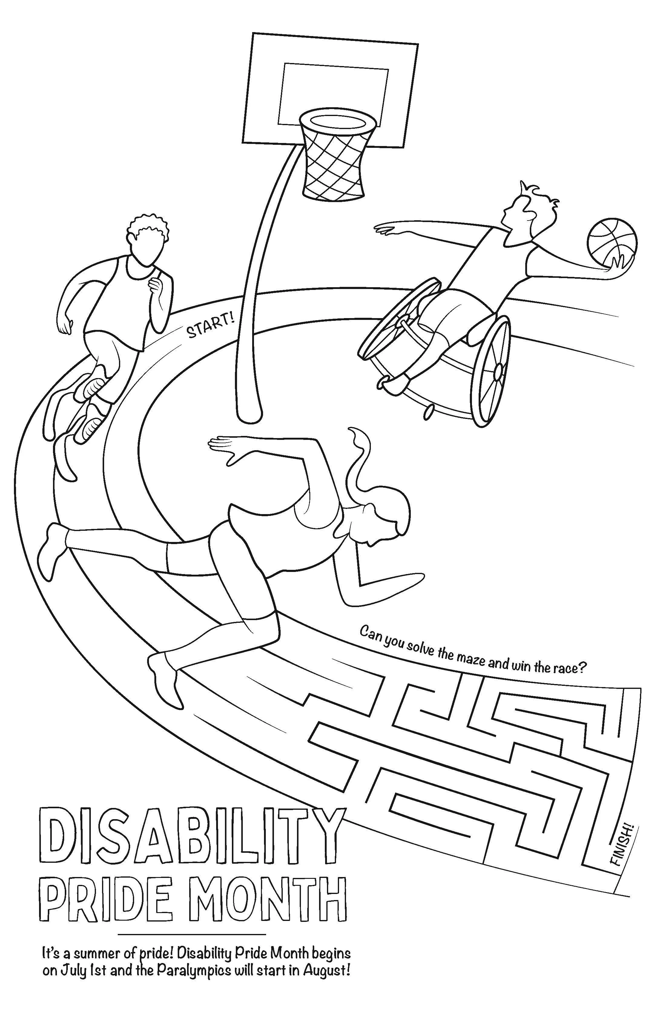 I was hired by the CPL to design coloring pages for the children’s library to celebrate Disability Pride Month. I was given total freedom to represent the disabled community and thought it would be a lot of fun to showcase the Paralympics and create a maze to make it more interactive.